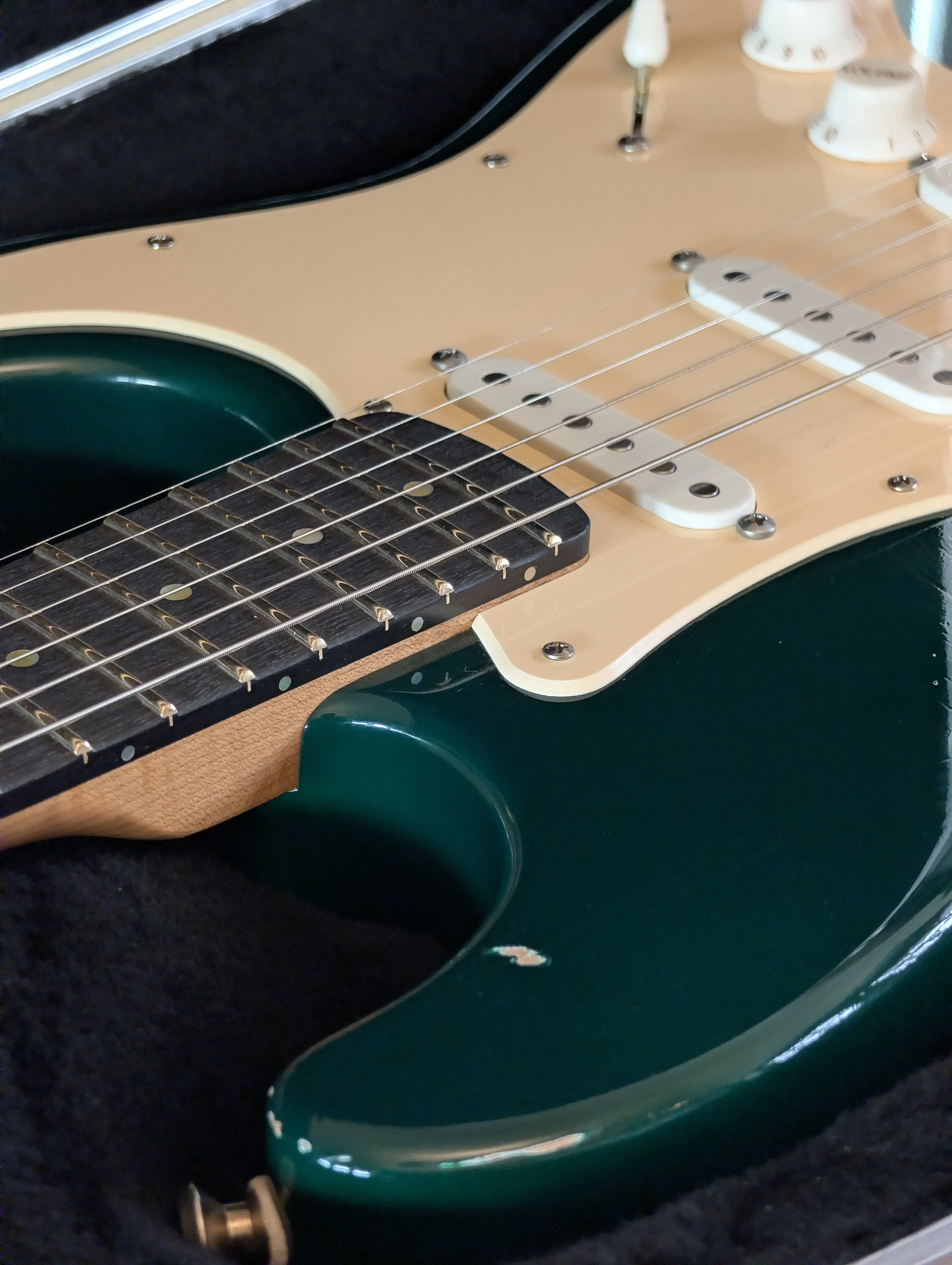 British racing green. One piece alder body, roasted maple neck, royal blackwood fingerboard. Moderate relic. Hardtail Callaham bridge. Features Lollar Blondes + Special S in the bridge.