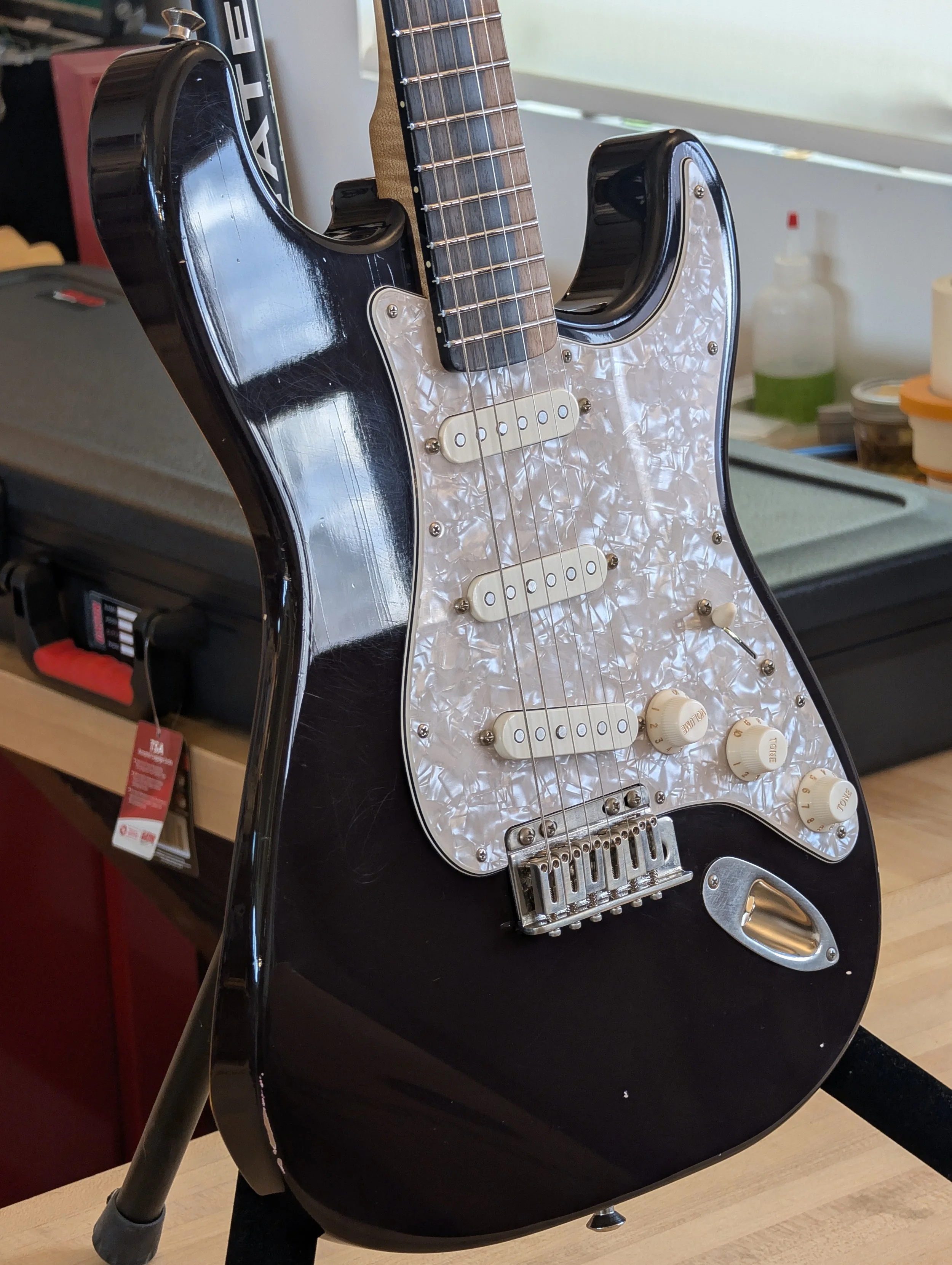 Alder body, ebony fretboard, maple neck. Moderate relic. Featuring Supervee Bladerunner trem and Fralin Vintage Hot + Blues Special pickups. Modern meets vintage.
