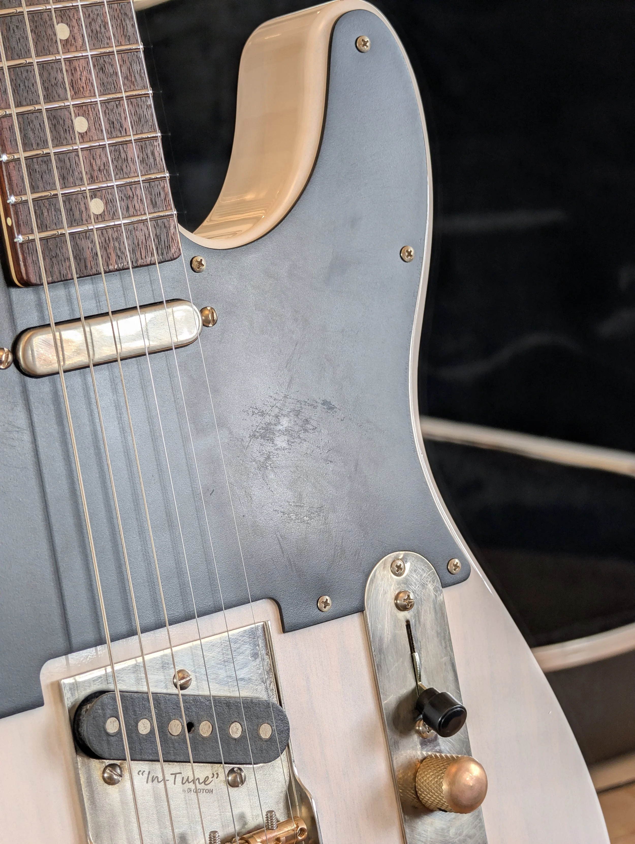 Maple neck, rosewood fretboard with a compound radius. Light relic. Lacquered bakelite pickguard featuring Bare Knuckle Flat 50’s pickups.